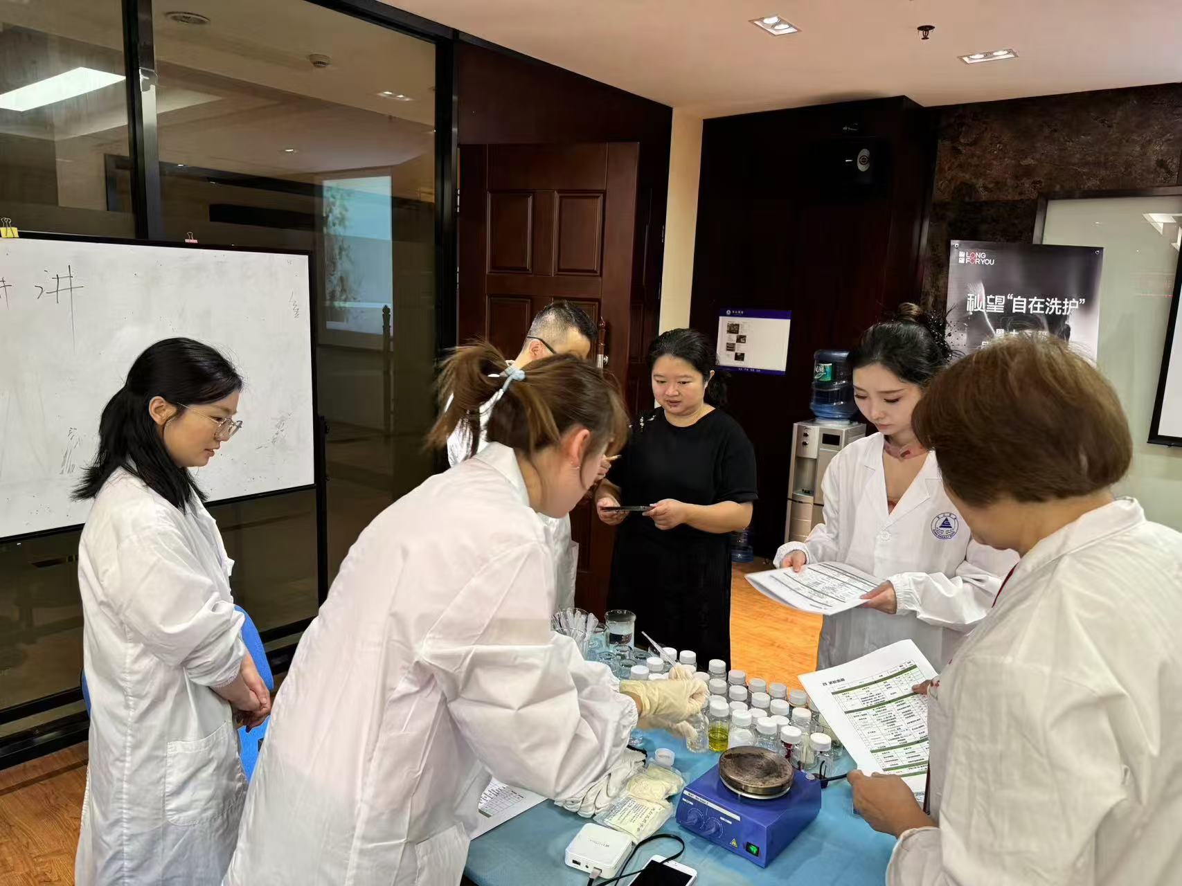 青山利康美业品牌总监张鹏深入讲解了青山美业大健康的品牌理念与产品布局;配方专家蒋逸仙介绍护肤品产品研发理念、生产工艺和质量控制标准,并通过现场演示,帮助培训班成员对护肤品的生产步骤有了更深入的了解。现场还安排了相关实验,学员们亲自参与了部分制备过程,实际操作了化妆品的配方调制和检测仪器的应用,进一步加深了对生产工艺的理解。